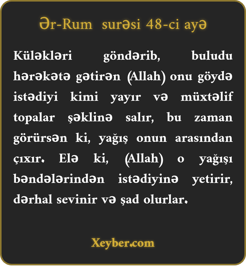 Küləkləri göndərib, buludu hərəkətə gətirən (Allah) onu göydə istədiyi kimi yayır və müxtəlif topalar şəklinə salır, bu zaman görürsən ki, yağış onun arasından çıxır. Elə ki, (Allah) o yağışı bəndələrindən istədiyinə yetirir, dərhal sevinir və şad olurlar.