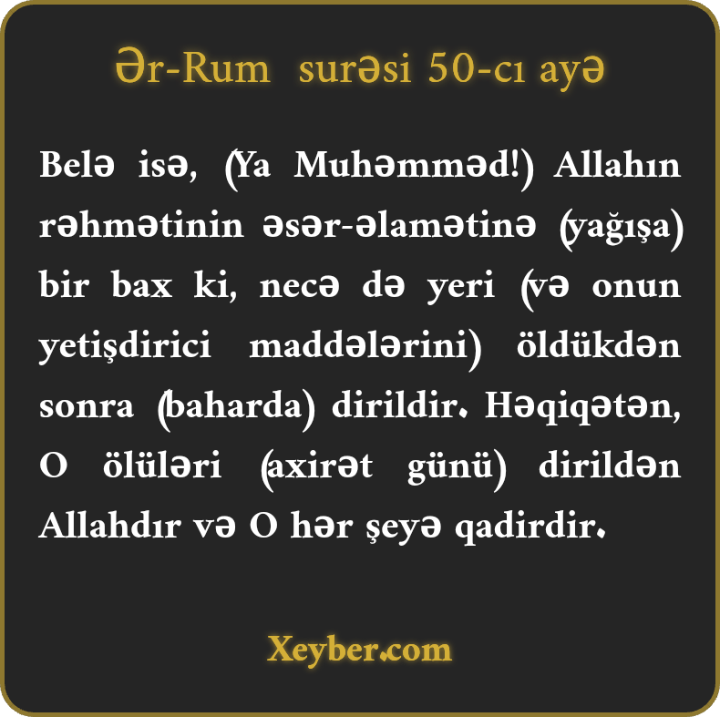 Belə isə, (Ya Muhəmməd!) Allahın rəhmətinin əsər-əlamətinə (yağışa) bir bax ki, necə də yeri (və onun yetişdirici maddələrini) öldükdən sonra (baharda) dirildir. Həqiqətən, O ölüləri (axirət günü) dirildən Allahdır və O hər şeyə qadirdir.