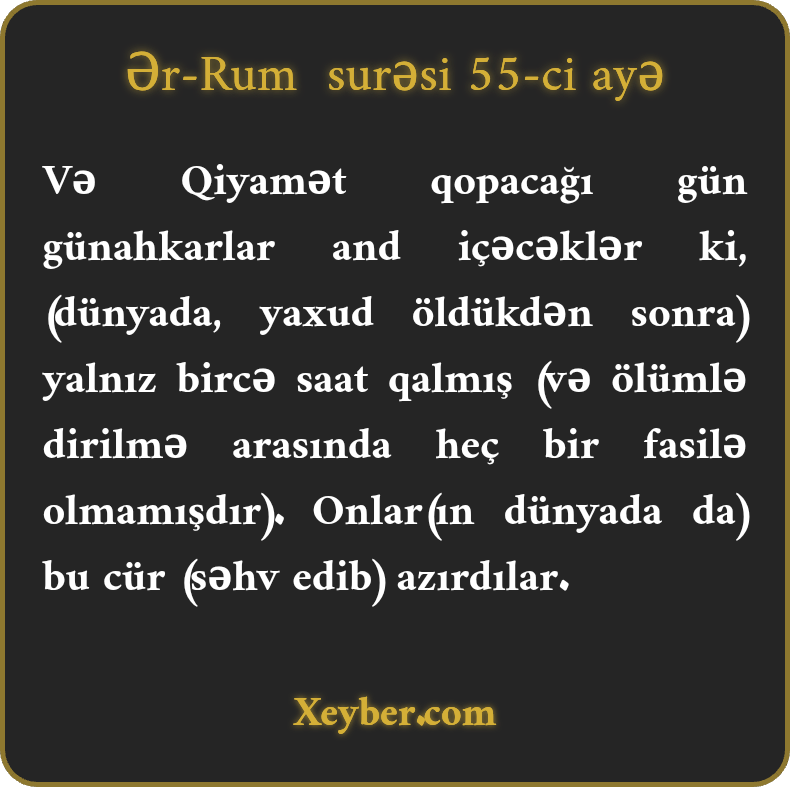 Və Qiyamət qopacağı gün günahkarlar and içəcəklər ki, (dünyada, yaxud öldükdən sonra) yalnız bircə saat qalmış (və ölümlə dirilmə arasında heç bir fasilə olmamışdır). Onlar(ın dünyada da) bu cür (səhv edib) azırdılar.