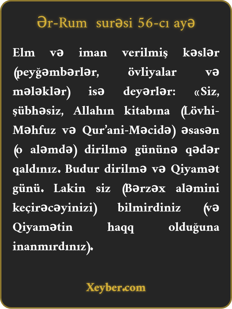 Elm və iman verilmiş kəslər (peyğəmbərlər, övliyalar və mələklər) isə deyərlər: «Siz, şübhəsiz, Allahın kitabına (Lövhi-Məhfuz və Qur’ani-Məcidə) əsasən (o aləmdə) dirilmə gününə qədər qaldınız. Budur dirilmə və Qiyamət günü. Lakin siz (Bərzəx aləmini keçirəcəyinizi) bilmirdiniz (və Qiyamətin haqq olduğuna inanmırdınız).