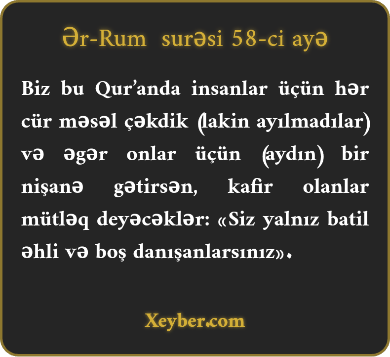 Biz bu Qur’anda insanlar üçün hər cür məsəl çəkdik (lakin ayılmadılar) və əgər onlar üçün (aydın) bir nişanə gətirsən, kafir olanlar mütləq deyəcəklər: «Siz yalnız batil əhli və boş danışanlarsınız».