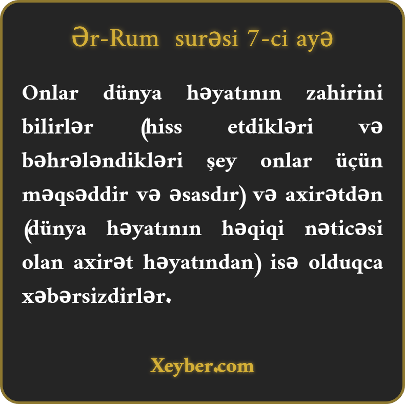 Onlar dünya həyatının zahirini bilirlər (hiss etdikləri və bəhrələndikləri şey onlar üçün məqsəddir və əsasdır) və axirətdən (dünya həyatının həqiqi nəticəsi olan axirət həyatından) isə olduqca xəbərsizdirlər.