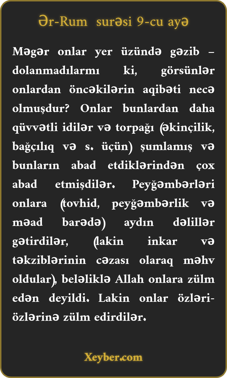 Məgər onlar yer üzündə gəzib – dolanmadılarmı ki, görsünlər onlardan öncəkilərin aqibəti necə olmuşdur? Onlar bunlardan daha qüvvətli idilər və torpağı (əkinçilik, bağçılıq və s. üçün) şumlamış və bunların abad etdiklərindən çox abad etmişdilər. Peyğəmbərləri onlara (tovhid, peyğəmbərlik və məad barədə) aydın dəlillər gətirdilər, (lakin inkar və təkziblərinin cəzası olaraq məhv oldular), beləliklə Allah onlara zülm edən deyildi. Lakin onlar özləri-özlərinə zülm edirdilər.