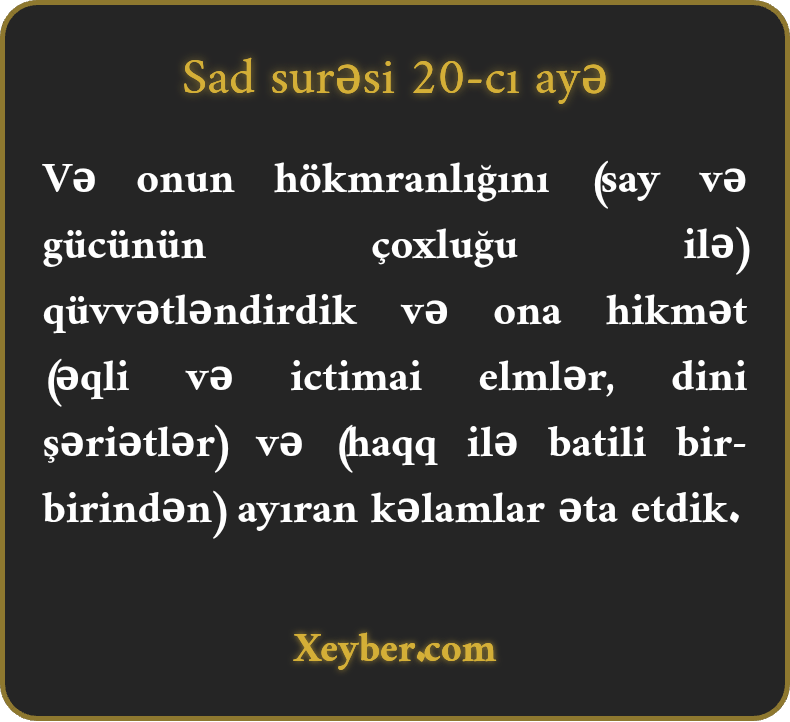 Və onun hökmranlığını (say və gücünün çoxluğu ilə) qüvvətləndirdik və ona hikmət (əqli və ictimai elmlər, dini şəriətlər) və (haqq ilə batili bir-birindən) ayıran kəlamlar əta etdik.