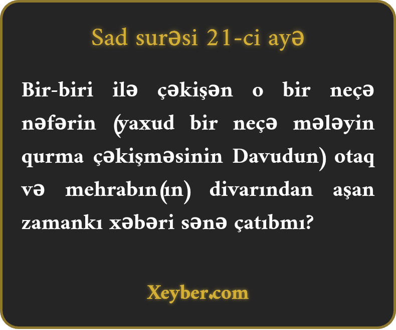 Bir-biri ilə çəkişən o bir neçə nəfərin (yaxud bir neçə mələyin qurma çəkişməsinin Davudun) otaq və mehrabın(ın) divarından aşan zamankı xəbəri sənə çatıbmı?