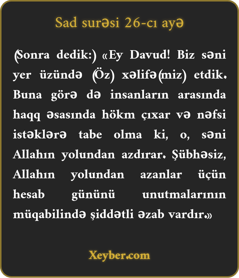 (Sonra dedik:) «Ey Davud! Biz səni yer üzündə (Öz) xəlifə(miz) etdik. Buna görə də insanların arasında haqq əsasında hökm çıxar və nəfsi istəklərə tabe olma ki, o, səni Allahın yolundan azdırar. Şübhəsiz, Allahın yolundan azanlar üçün hesab gününü unutmalarının müqabilində şiddətli əzab vardır.»