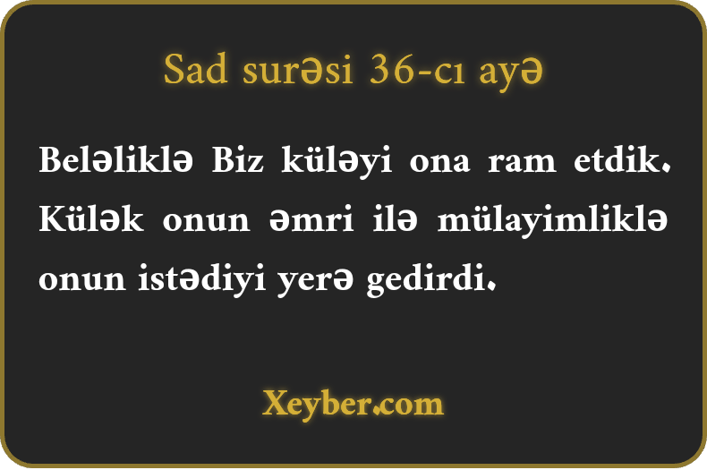 Beləliklə Biz küləyi ona ram etdik. Külək onun əmri ilə mülayimliklə onun istədiyi yerə gedirdi.