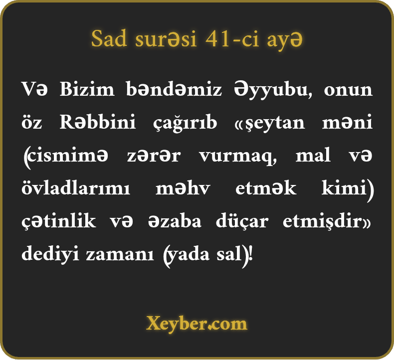 Və Bizim bəndəmiz Əyyubu, onun öz Rəbbini çağırıb «şeytan məni (cismimə zərər vurmaq, mal və övladlarımı məhv etmək kimi) çətinlik və əzaba düçar etmişdir» dediyi zamanı (yada sal)!