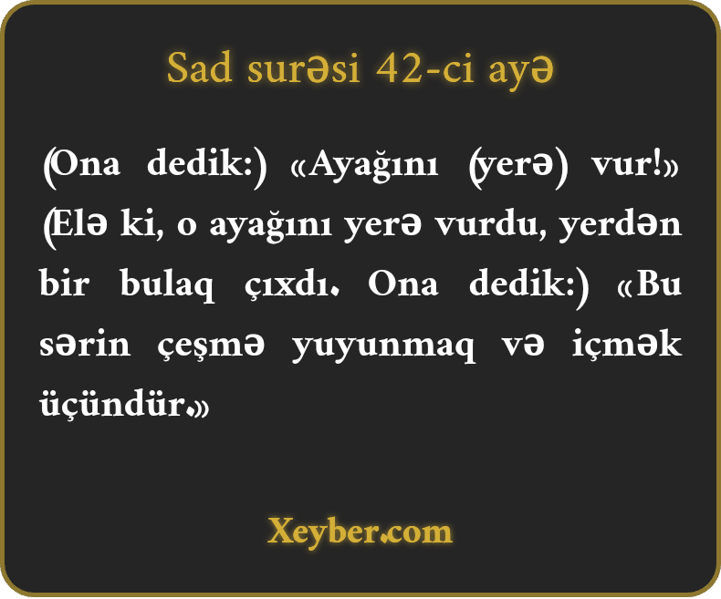 (Ona dedik:) «Ayağını (yerə) vur!» (Elə ki, o ayağını yerə vurdu, yerdən bir bulaq çıxdı. Ona dedik:) «Bu sərin çeşmə yuyunmaq və içmək üçündür.»