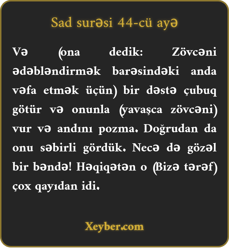 Və (ona dedik: Zövcəni ədəbləndirmək barəsindəki anda vəfa etmək üçün) bir dəstə çubuq götür və onunla (yavaşca zövcəni) vur və andını pozma. Doğrudan da onu səbirli gördük. Necə də gözəl bir bəndə! Həqiqətən o (Bizə tərəf) çox qayıdan idi.