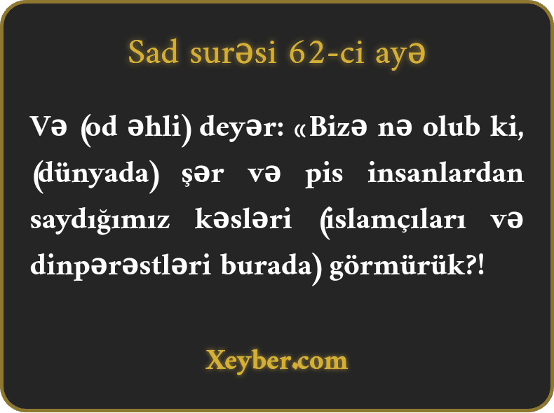 Və (od əhli) deyər: «Bizə nə olub ki, (dünyada) şər və pis insanlardan saydığımız kəsləri (islamçıları və dinpərəstləri burada) görmürük?!