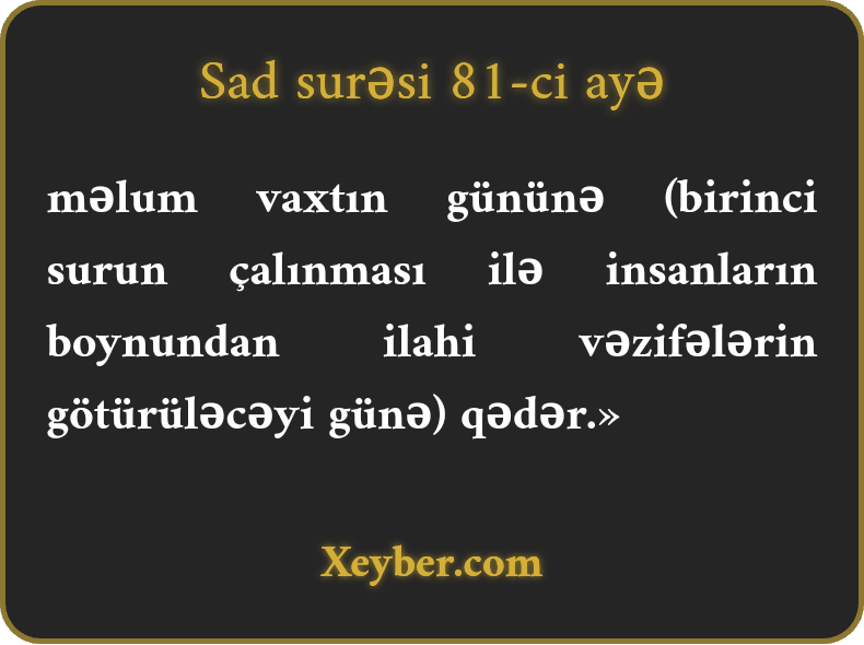 məlum vaxtın gününə (birinci surun çalınması ilə insanların boynundan ilahi vəzifələrin götürüləcəyi günə) qədər.»