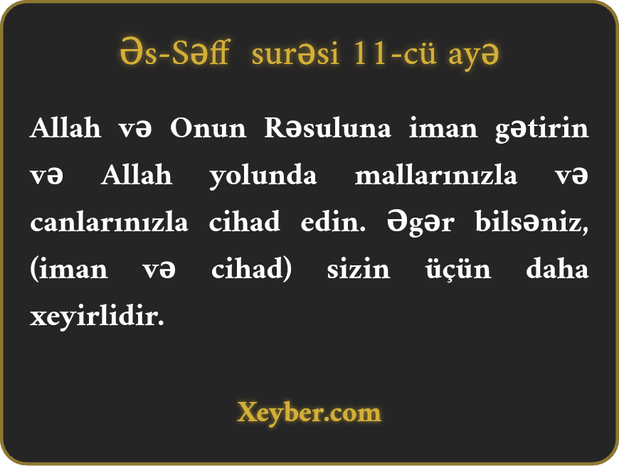 Allah və Onun Rəsuluna iman gətirin və Allah yolunda mallarınızla və canlarınızla cihad edin. Əgər bilsəniz, (iman və cihad) sizin üçün daha xeyirlidir.