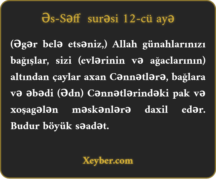 (Əgər belə etsəniz,) Allah günahlarınızı bağışlar, sizi (evlərinin və ağaclarının) altından çaylar axan Cənnətlərə, bağlara və əbədi (Ədn) Cənnətlərindəki pak və xoşagələn məskənlərə daxil edər. Budur böyük səadət.