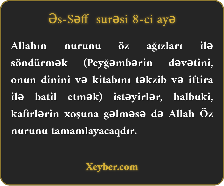 Allahın nurunu öz ağızları ilə söndürmək (Peyğəmbərin dəvətini, onun dinini və kitabını təkzib və iftira ilə batil etmək) istəyirlər, halbuki, kafirlərin xoşuna gəlməsə də Allah Öz nurunu tamamlayacaqdır.