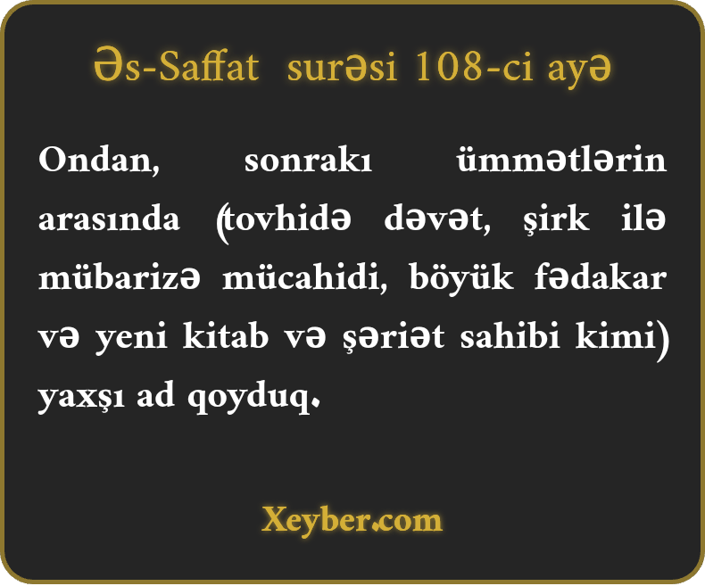 Ondan, sonrakı ümmətlərin arasında (tovhidə dəvət, şirk ilə mübarizə mücahidi, böyük fədakar və yeni kitab və şəriət sahibi kimi) yaxşı ad qoyduq.