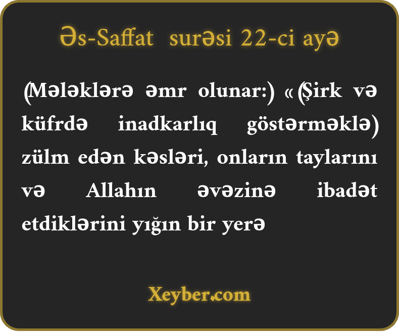 (Mələklərə əmr olunar:) «(Şirk və küfrdə inadkarlıq göstərməklə) zülm edən kəsləri, onların taylarını və Allahın əvəzinə ibadət etdiklərini yığın bir yerə