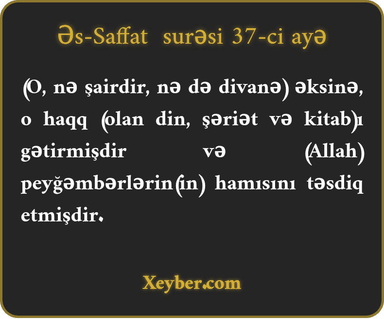 (O, nə şairdir, nə də divanə) əksinə, o haqq (olan din, şəriət və kitab)ı gətirmişdir və (Allah) peyğəmbərlərin(in) hamısını təsdiq etmişdir.