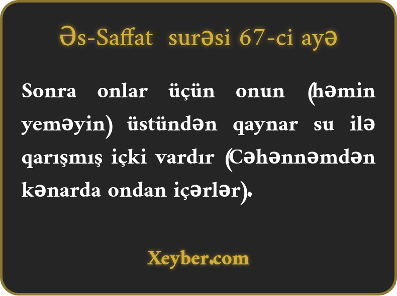 Sonra onlar üçün onun (həmin yeməyin) üstündən qaynar su ilə qarışmış içki vardır (Cəhənnəmdən kənarda ondan içərlər).