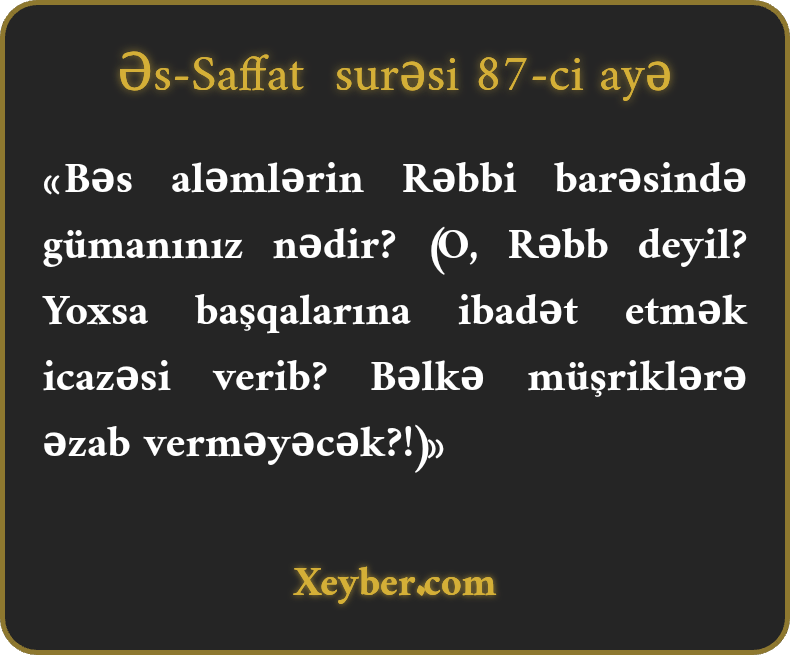 «Bəs aləmlərin Rəbbi barəsində gümanınız nədir? (O, Rəbb deyil? Yoxsa başqalarına ibadət etmək icazəsi verib? Bəlkə müşriklərə əzab verməyəcək?!)»
