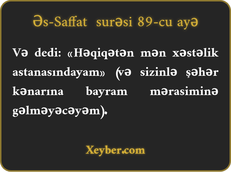 Və dedi: «Həqiqətən mən xəstəlik astanasındayam» (və sizinlə şəhər kənarına bayram mərasiminə gəlməyəcəyəm).