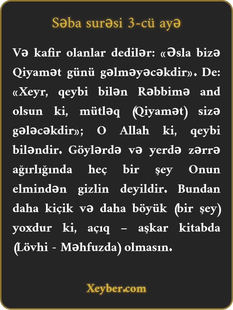 Və kafir olanlar dedilər: «Əsla bizə Qiyamət günü gəlməyəcəkdir». De: «Xeyr, qeybi bilən Rəbbimə and olsun ki, mütləq (Qiyamət) sizə gələcəkdir»; O Allah ki, qeybi biləndir. Göylərdə və yerdə zərrə ağırlığında heç bir şey Onun elmindən gizlin deyildir. Bundan daha kiçik və daha böyük (bir şey) yoxdur ki, açıq – aşkar kitabda (Lövhi - Məhfuzda) olmasın.