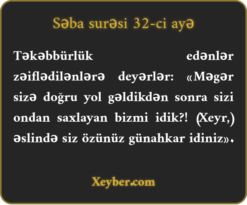 Təkəbbürlük edənlər zəiflədilənlərə deyərlər: «Məgər sizə doğru yol gəldikdən sonra sizi ondan saxlayan bizmi idik?! (Xeyr,) əslində siz özünüz günahkar idiniz».