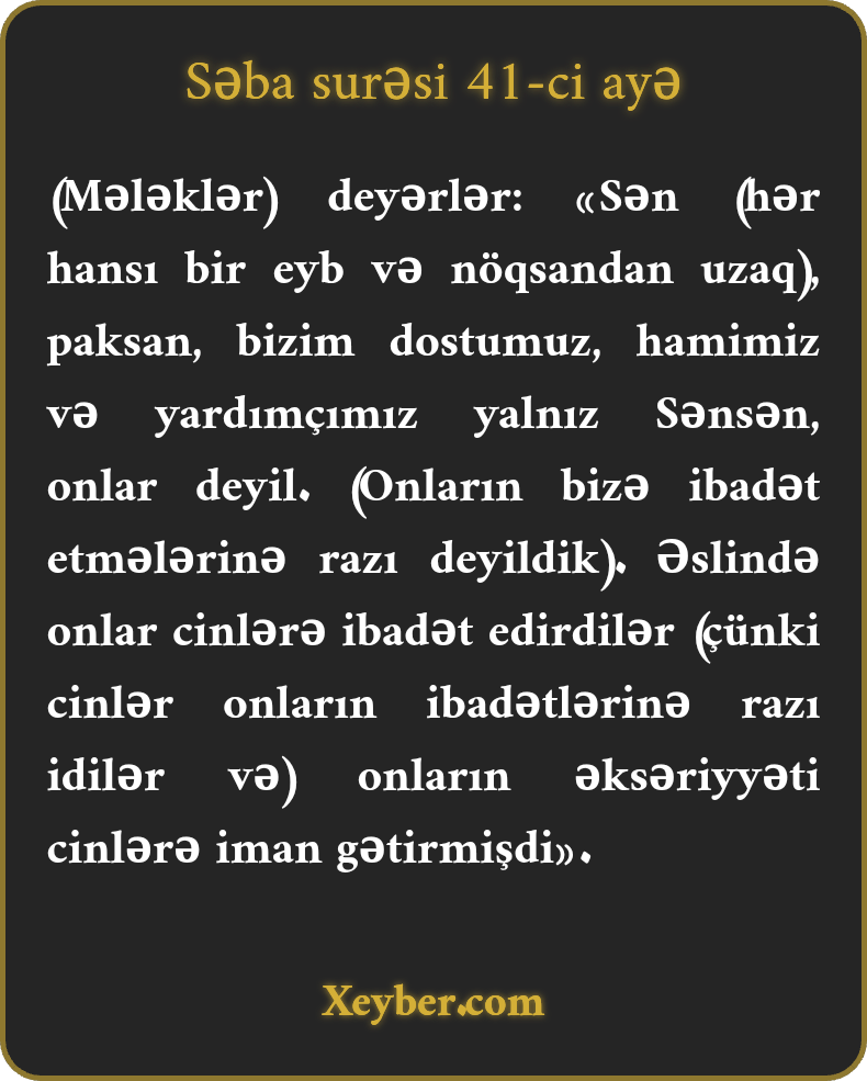 (Mələklər) deyərlər: «Sən (hər hansı bir eyb və nöqsandan uzaq), paksan, bizim dostumuz, hamimiz və yardımçımız yalnız Sənsən, onlar deyil. (Onların bizə ibadət etmələrinə razı deyildik). Əslində onlar cinlərə ibadət edirdilər (çünki cinlər onların ibadətlərinə razı idilər və) onların əksəriyyəti cinlərə iman gətirmişdi».