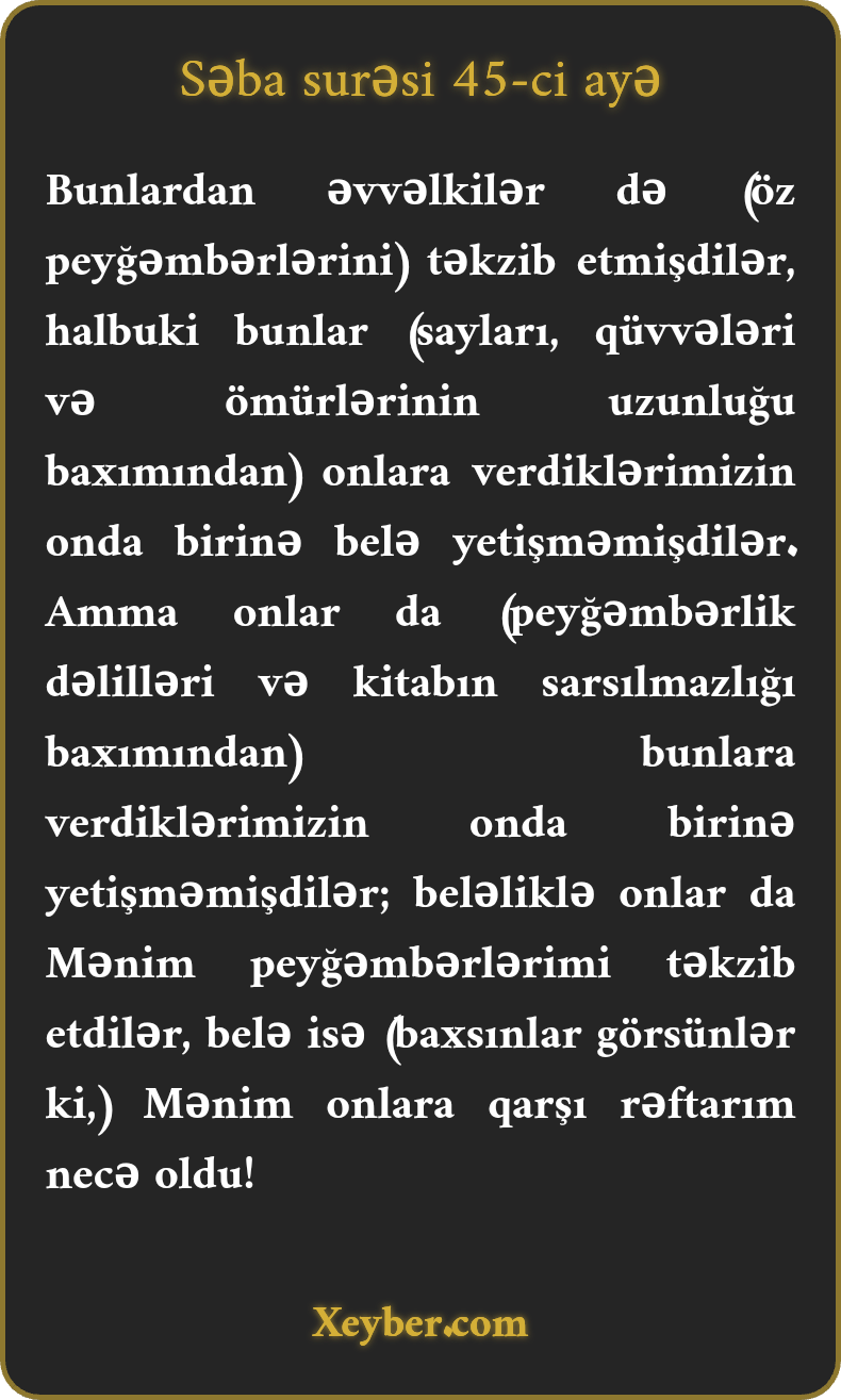 Bunlardan əvvəlkilər də (öz peyğəmbərlərini) təkzib etmişdilər, halbuki bunlar (sayları, qüvvələri və ömürlərinin uzunluğu baxımından) onlara verdiklərimizin onda birinə belə yetişməmişdilər. Amma onlar da (peyğəmbərlik dəlilləri və kitabın sarsılmazlığı baxımından) bunlara verdiklərimizin onda birinə yetişməmişdilər; beləliklə onlar da Mənim peyğəmbərlərimi təkzib etdilər, belə isə (baxsınlar görsünlər ki,) Mənim onlara qarşı rəftarım necə oldu!