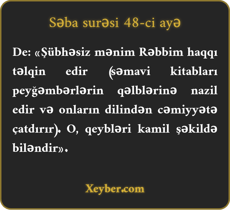 De: «Şübhəsiz mənim Rəbbim haqqı təlqin edir (səmavi kitabları peyğəmbərlərin qəlblərinə nazil edir və onların dilindən cəmiyyətə çatdırır). O, qeybləri kamil şəkildə biləndir».