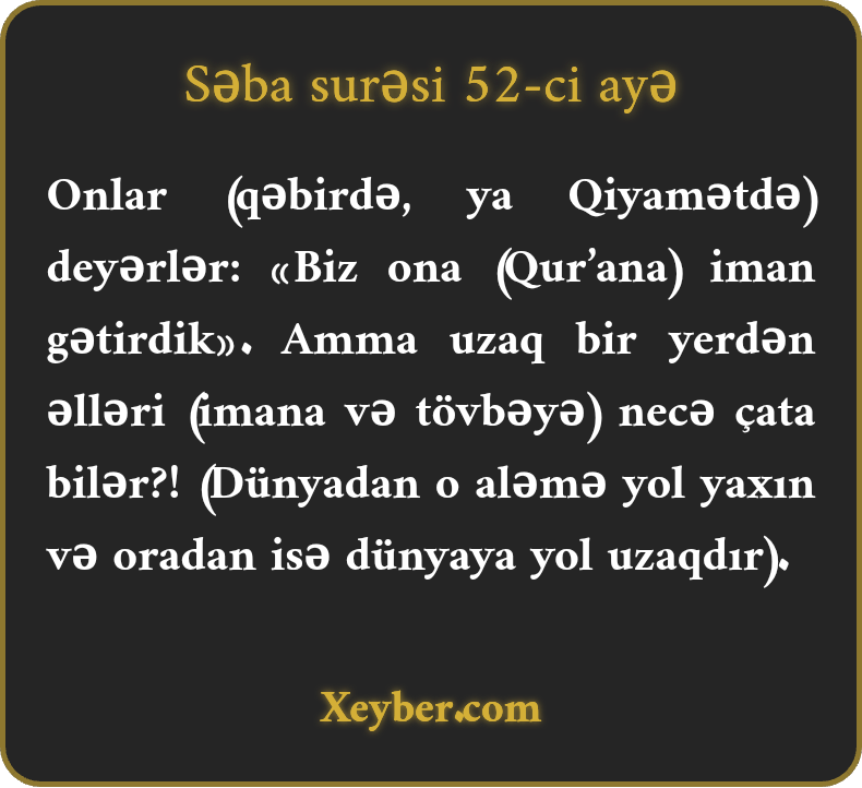 Onlar (qəbirdə, ya Qiyamətdə) deyərlər: «Biz ona (Qur’ana) iman gətirdik». Amma uzaq bir yerdən əlləri (imana və tövbəyə) necə çata bilər?! (Dünyadan o aləmə yol yaxın və oradan isə dünyaya yol uzaqdır).