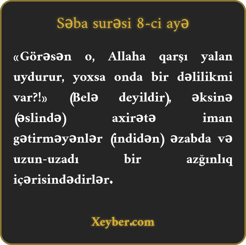 «Görəsən o, Allaha qarşı yalan uydurur, yoxsa onda bir dəlilikmi var?!» (Belə deyildir), əksinə (əslində) axirətə iman gətirməyənlər (indidən) əzabda və uzun-uzadı bir azğınlıq içərisindədirlər.