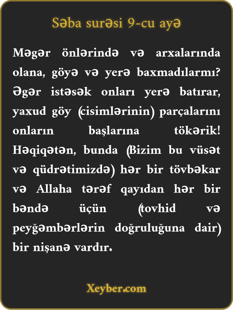 Məgər önlərində və arxalarında olana, göyə və yerə baxmadılarmı? Əgər istəsək onları yerə batırar, yaxud göy (cisimlərinin) parçalarını onların başlarına tökərik! Həqiqətən, bunda (Bizim bu vüsət və qüdrətimizdə) hər bir tövbəkar və Allaha tərəf qayıdan hər bir bəndə üçün (tovhid və peyğəmbərlərin doğruluğuna dair) bir nişanə vardır.