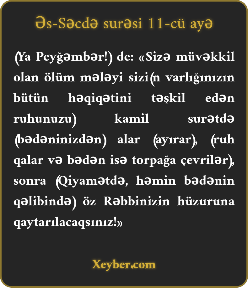 (Ya Peyğəmbər!) de: «Sizə müvəkkil olan ölüm mələyi sizi(n varlığınızın bütün həqiqətini təşkil edən ruhunuzu) kamil surətdə (bədəninizdən) alar (ayırar), (ruh qalar və bədən isə torpağa çevrilər), sonra (Qiyamətdə, həmin bədənin qəlibində) öz Rəbbinizin hüzuruna qaytarılacaqsınız!»