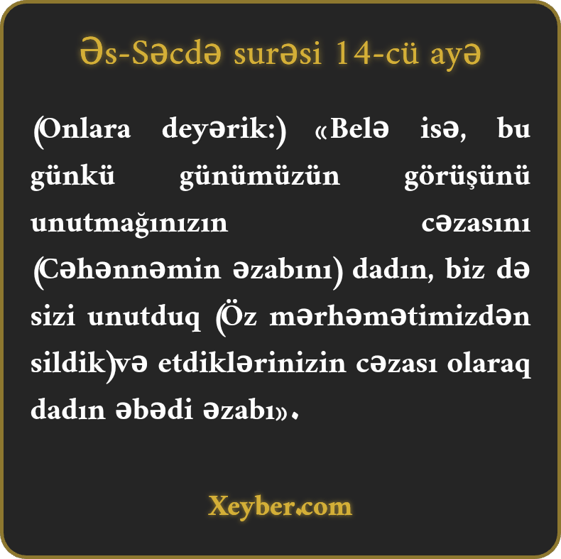 (Onlara deyərik:) «Belə isə, bu günkü günümüzün görüşünü unutmağınızın cəzasını (Cəhənnəmin əzabını) dadın, biz də sizi unutduq (Öz mərhəmətimizdən sildik)və etdiklərinizin cəzası olaraq dadın əbədi əzabı».