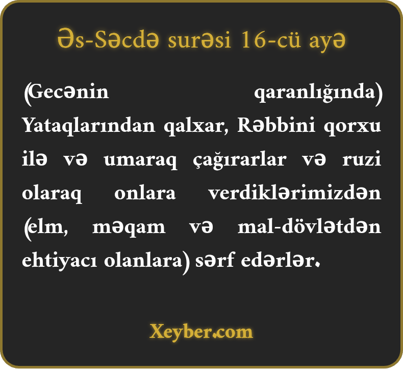 (Gecənin qaranlığında) Yataqlarından qalxar, Rəbbini qorxu ilə və umaraq çağırarlar və ruzi olaraq onlara verdiklərimizdən (elm, məqam və mal-dövlətdən ehtiyacı olanlara) sərf edərlər.