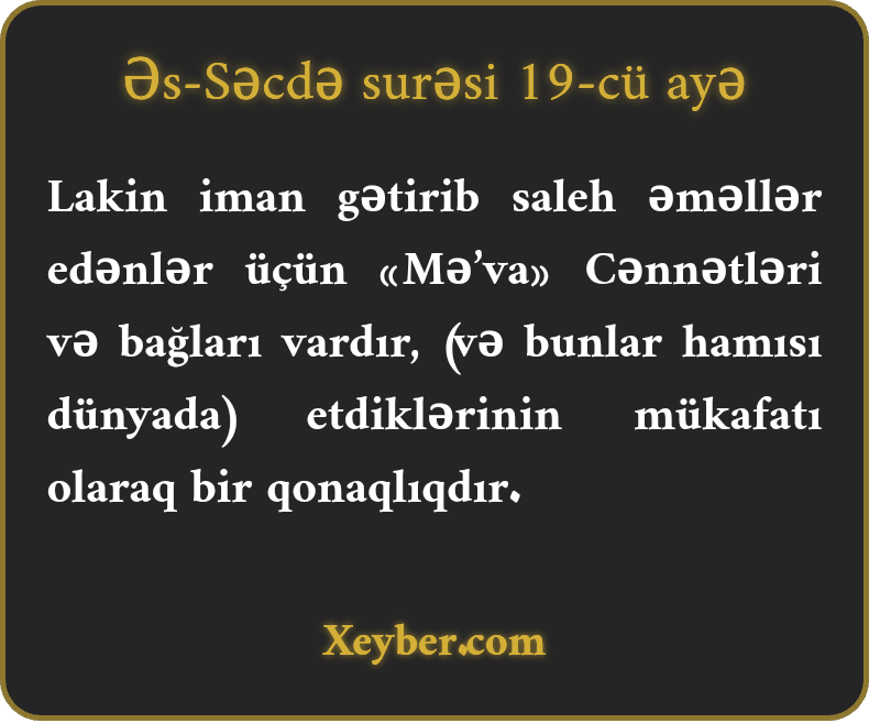 Lakin iman gətirib saleh əməllər edənlər üçün «Mə’va» Cənnətləri və bağları vardır, (və bunlar hamısı dünyada) etdiklərinin mükafatı olaraq bir qonaqlıqdır.