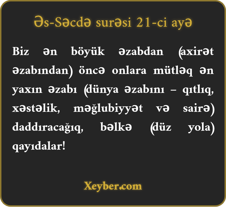 Biz ən böyük əzabdan (axirət əzabından) öncə onlara mütləq ən yaxın əzabı (dünya əzabını – qıtlıq, xəstəlik, məğlubiyyət və sairə) daddıracağıq, bəlkə (düz yola) qayıdalar!