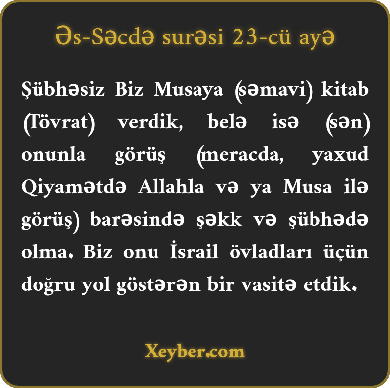 Şübhəsiz Biz Musaya (səmavi) kitab (Tövrat) verdik, belə isə (sən) onunla görüş (meracda, yaxud Qiyamətdə Allahla və ya Musa ilə görüş) barəsində şəkk və şübhədə olma. Biz onu İsrail övladları üçün doğru yol göstərən bir vasitə etdik.