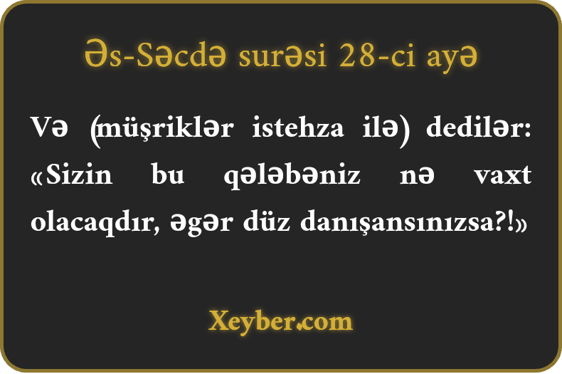 Və (müşriklər istehza ilə) dedilər: «Sizin bu qələbəniz nə vaxt olacaqdır, əgər düz danışansınızsa?!»