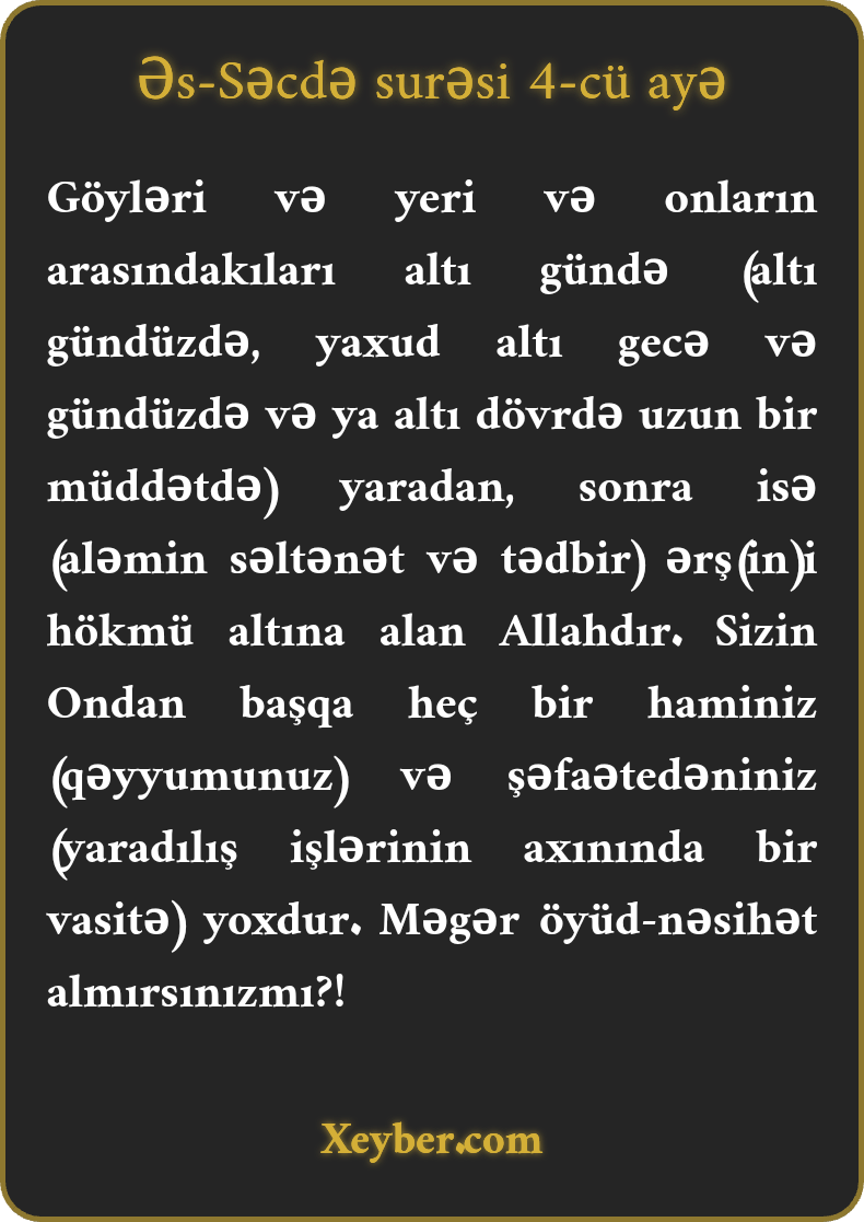 Göyləri və yeri və onların arasındakıları altı gündə (altı gündüzdə, yaxud altı gecə və gündüzdə və ya altı dövrdə uzun bir müddətdə) yaradan, sonra isə (aləmin səltənət və tədbir) ərş(in)i hökmü altına alan Allahdır. Sizin Ondan başqa heç bir haminiz (qəyyumunuz) və şəfaətedəniniz (yaradılış işlərinin axınında bir vasitə) yoxdur. Məgər öyüd-nəsihət almırsınızmı?!