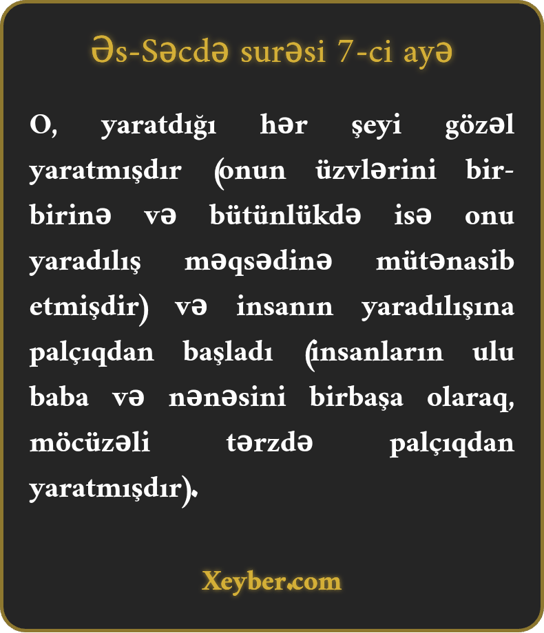 O, yaratdığı hər şeyi gözəl yaratmışdır (onun üzvlərini bir-birinə və bütünlükdə isə onu yaradılış məqsədinə mütənasib etmişdir) və insanın yaradılışına palçıqdan başladı (insanların ulu baba və nənəsini birbaşa olaraq, möcüzəli tərzdə palçıqdan yaratmışdır).