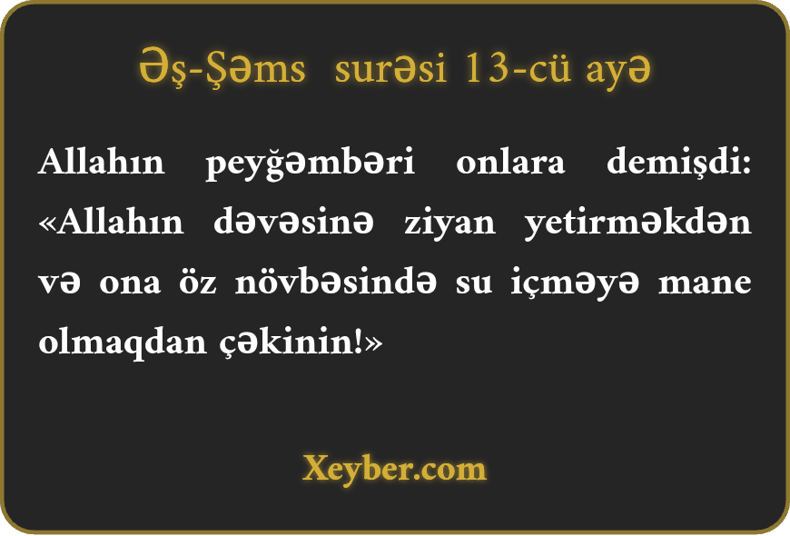 Allahın peyğəmbəri onlara demişdi: «Allahın dəvəsinə ziyan yetirməkdən və ona öz növbəsində su içməyə mane olmaqdan çəkinin!»