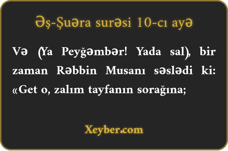 Və (Ya Peyğəmbər! Yada sal), bir zaman Rəbbin Musanı səslədi ki: «Get o, zalım tayfanın sorağına;