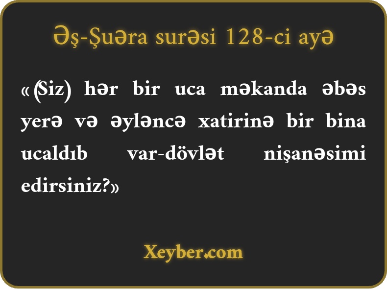«(Siz) hər bir uca məkanda əbəs yerə və əyləncə xatirinə bir bina ucaldıb var-dövlət nişanəsimi edirsiniz?»