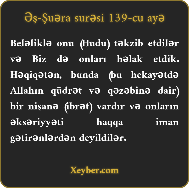 Beləliklə onu (Hudu) təkzib etdilər və Biz də onları həlak etdik. Həqiqətən, bunda (bu hekayətdə Allahın qüdrət və qəzəbinə dair) bir nişanə (ibrət) vardır və onların əksəriyyəti haqqa iman gətirənlərdən deyildilər.