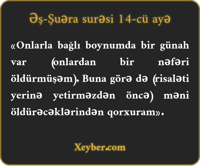 «Onlarla bağlı boynumda bir günah var (onlardan bir nəfəri öldürmüşəm). Buna görə də (risaləti yerinə yetirməzdən öncə) məni öldürəcəklərindən qorxuram».