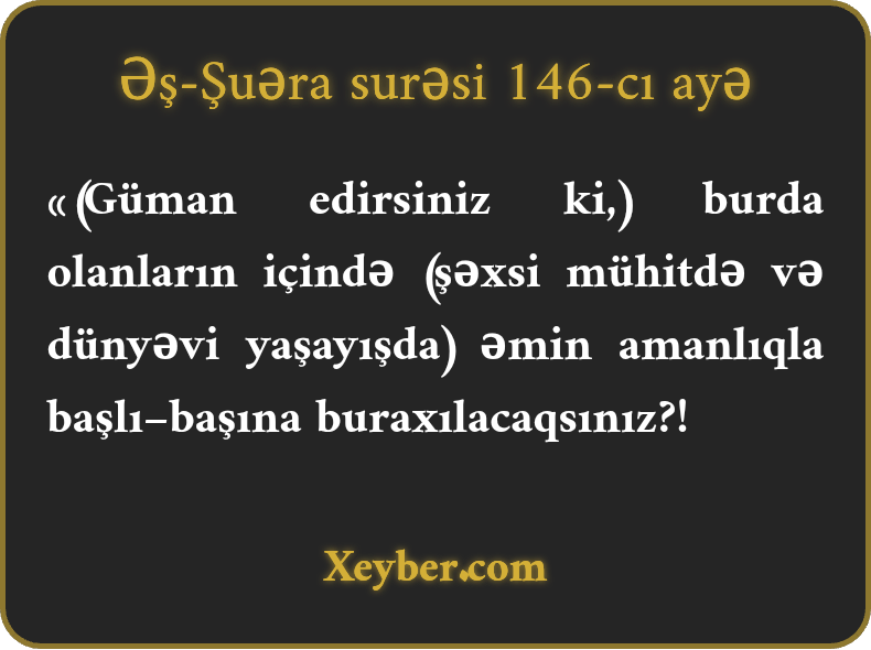 «(Güman edirsiniz ki,) burda olanların içində (şəxsi mühitdə və dünyəvi yaşayışda) əmin amanlıqla başlı–başına buraxılacaqsınız?!