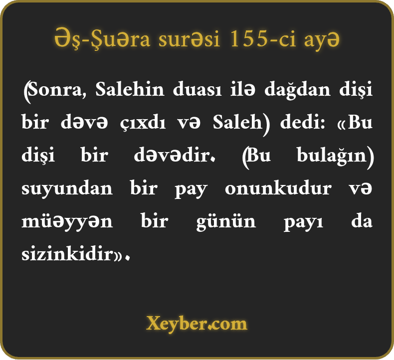 (Sonra, Salehin duası ilə dağdan dişi bir dəvə çıxdı və Saleh) dedi: «Bu dişi bir dəvədir. (Bu bulağın) suyundan bir pay onunkudur və müəyyən bir günün payı da sizinkidir».