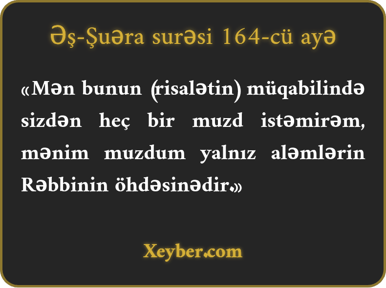 «Mən bunun (risalətin) müqabilində sizdən heç bir muzd istəmirəm, mənim muzdum yalnız aləmlərin Rəbbinin öhdəsinədir.»